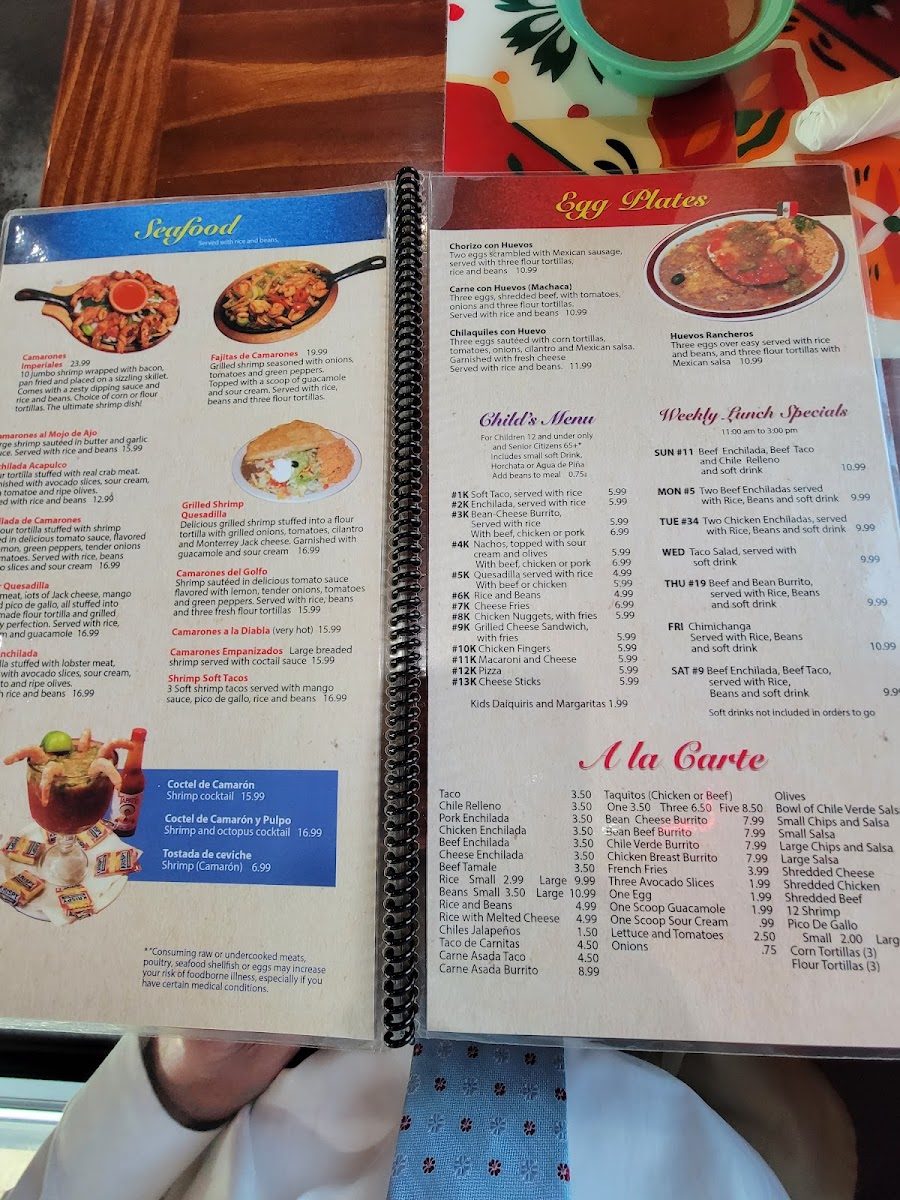 Three over easy eggs on a crisp corn tortilla, topped with red Mexican salsa. Served with rice, beans, and flour or corn tortillas. Garnished with lettuce, tomatoes, and avocado.